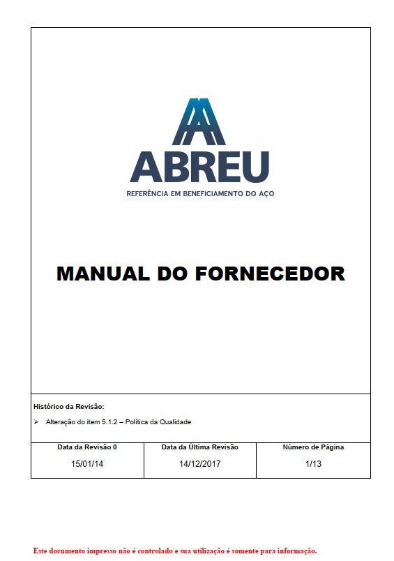 Faça o download do Manual do Fornecedor da AAbreu - um guia prático e importante na relação de fornecimento de componentes, matérias-primas e serviços relevantes ao cumprimento das metas definidas pela empresa. Dessa forma, esperamos assegurar a melhoria contínua nas aquisições com qualidade e produtividade, em forte parceria entre a AAbreu e seus fornecedores.